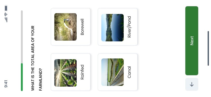 Large, thumb-friendly buttons: Options like Rainfed, Borewell, Canal, River/Pond are shown as big photo cards, easy to recognize and tap.